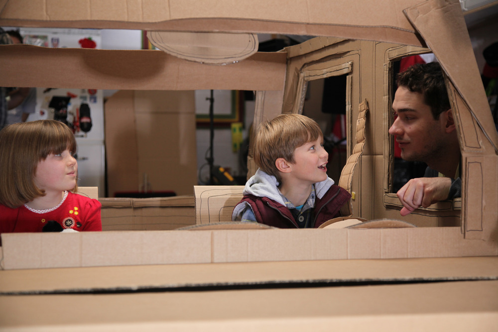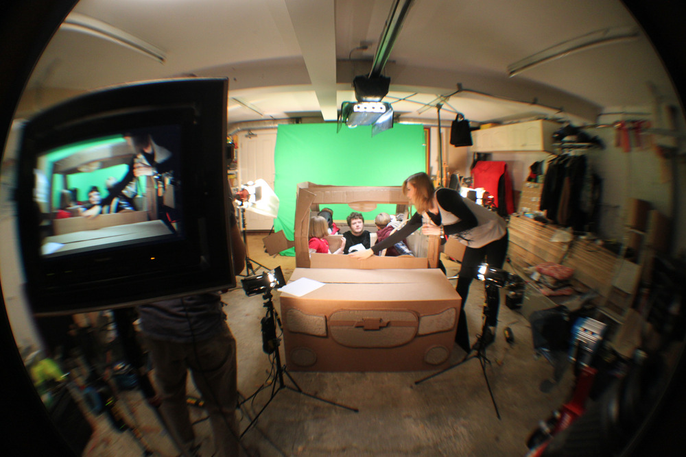Surprisingly the cardboard car, which was built over the last two weeks in our hallway at home… managed to withstand two child actors in it for two days…and is still in good condition. So kids out there, if you not allowed to drive yet, I recommend one of these, they’re really a lot of fun and they can take you on amazing road trips, too. 😉